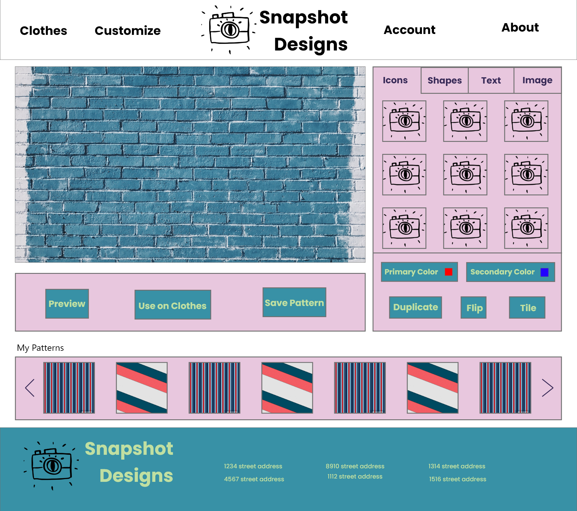 Snapshot Designs is a website aimed at simplifying the process of creating custom clothes for any occasion. Whether it be making uniforms for a sports team or designing clothes for a personal celebrations the goal of the website was to create an experience for users that allowed them to quickly and effortlessly design new clothes and patterns. I wanted to design this website due to my own experience of frustration when using similar websites to make t-shirts for a class trip. Despite the hours I had put into planing out and trying to creating the shirts I found myself frustrated with the process and dissatisfied with how the final product turned out. I aimed to remedy those frustrating experience through my own designs for this website.