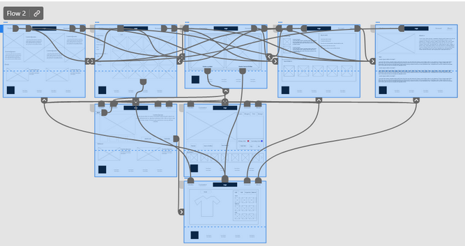 After creating digital wireframes for the main user flow in Adobe XD I went through the steps to create the low-fidelity prototype to get feedback from a usability study. The low-fidelity prototype connected the primary user flow of finding and customizing a shirt from the site. Before presenting it for the user study I took some time to review the flow to add any missing pages to improve the users experience before getting feedback.