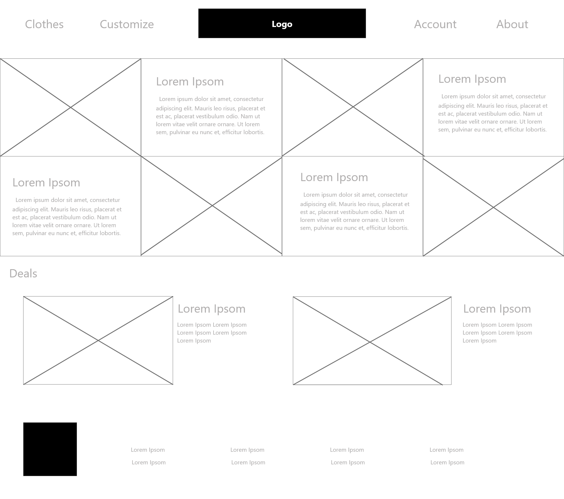 Moving from paper to digital wireframes it became easier to see how the design could address the users “pains points” and improve their experience over all. I used a panel of cards layout to help showcase some of the clothing users could customize as this layout provide easily accessible information and a visual preview of the product. Along with this I added a navigation bar at the top center of the page allowing for easy navigation to pages of most importance.
