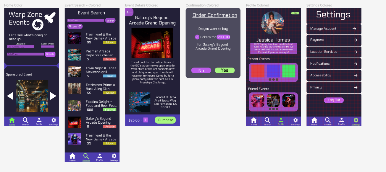The idea for Warp Zone Events came from seeing busy students and workers who like to attend social events-myself included-but who lack the time to do research on when and where new events would happen. To help solve this issue I designed an app that could allow users to find events happening in their local area without having to spend lots of time scrolling various websites or local postings. All the information they would need would be centralized on the app; easy to find and filter through to get to the events that matter to them.